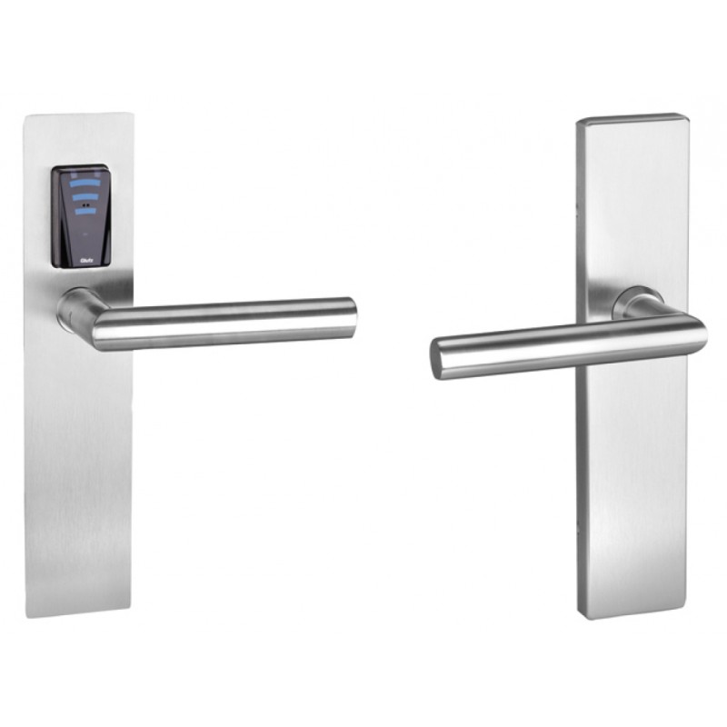Ferrure de sécurité électronique fonctionnant à piles pour portes pleines intérieures et extérieures. De l’extérieur, l’ouverture et la fermeture sont actionnées en lisant le support RFID. La poignée intérieure permet d'ouvrir la porte à tout moment. Conformité à la norme EN179 assurée avec la poignée de porte adaptée.