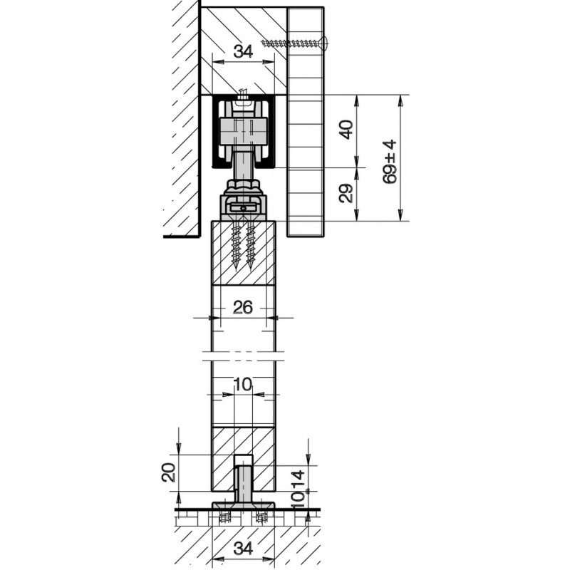 avec suspension à deux voies, pour montage au plafond, réglable en hauteur +/- 4 mm et réglage de côté +/- 2 mm, ajustage facile, chariots fonctionnement facile et silencieux