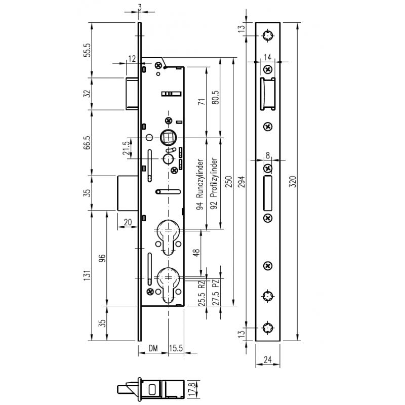 Serrure à mortaiser de sécurité, avec 2 entailles pour cylindre